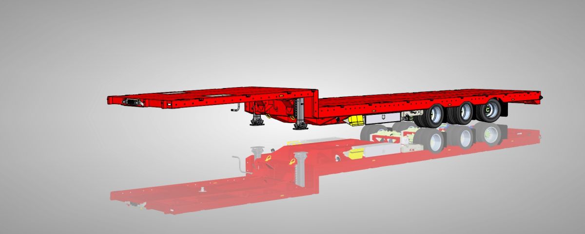 3-assige oplegger voor het vervoer van smalle, lange of hoge elementen zoals prefab-beton of panelen. Dankzij de onafhankelijke wielophanging realiseren we een ultra-lage laadvloerhoogte van 280 mm. - Semie-dieplader